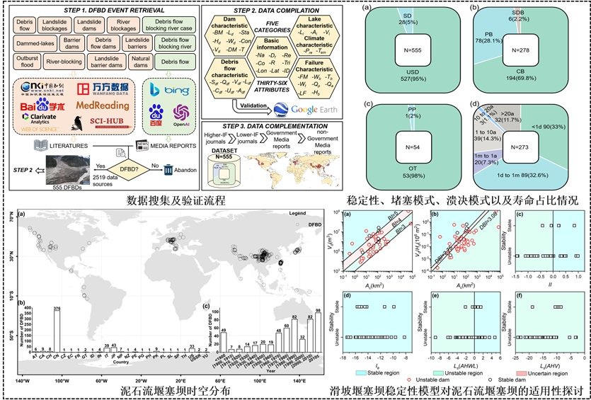 该数据库的开放共享为泥石流堵江灾害的风险评估、预警模型构建及防治工程设计提供了关键支撑,标志着我国在山地灾害链生机制研究领域取得重要进展。该成果近期以“A worldwide event-based debris-flow barrier dam dataset from 1800 to 2023”为题,被一区TOP期刊 Earth System Science Data 正式录用。该研究得到西藏自治区科技计划项目(XZ202301ZY0039G)、第二次青藏高原综合科学考察研究项目(2019QZKK0902)、成都山地所自主部署项目(IMHE-ZDRW-01)、四川省科技计划项目(2024NSFSC0072)及国家自然科学基金(52409109)的共同资助。