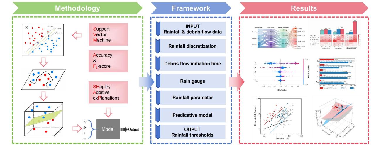 针对这一科学问题,成都山地所郭晓军研究员团队将人工智能方法创新性地引入小流域泥石流降雨阈值不确定性研究。该团队运用非线性高斯核支持向量机(NGK-SVM)筛选最优预测参数和流程,解决了传统统计方法难以捕捉降雨与泥石流关联的问题,并结合 SHapley 可解释性分析(SHAP)量化了各降雨参数对预报结果的贡献程度,评估各参数的重要性及其对结果的影响,克服了人工智能的 “黑箱” 困境。