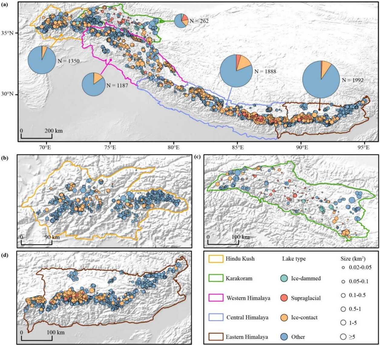 兴都库什-喀喇昆仑-喜马拉雅(HKH)地区的冰湖变化,不仅是气候变化的重要指示器,更直接关乎下游数亿人口的水资源安全与灾害风险防范,尤其是由冰湖溃决引发的洪水(GLOFs)等极端事件。然而,由于该地区地形极为复杂,加之常年受到云层遮挡、地形阴影以及季节性积雪覆盖的影响,这些因素显著制约了冰湖自动制图的精度,使得我们对该地区冰湖现状及其动态变化的认知仍然存在较大局限。