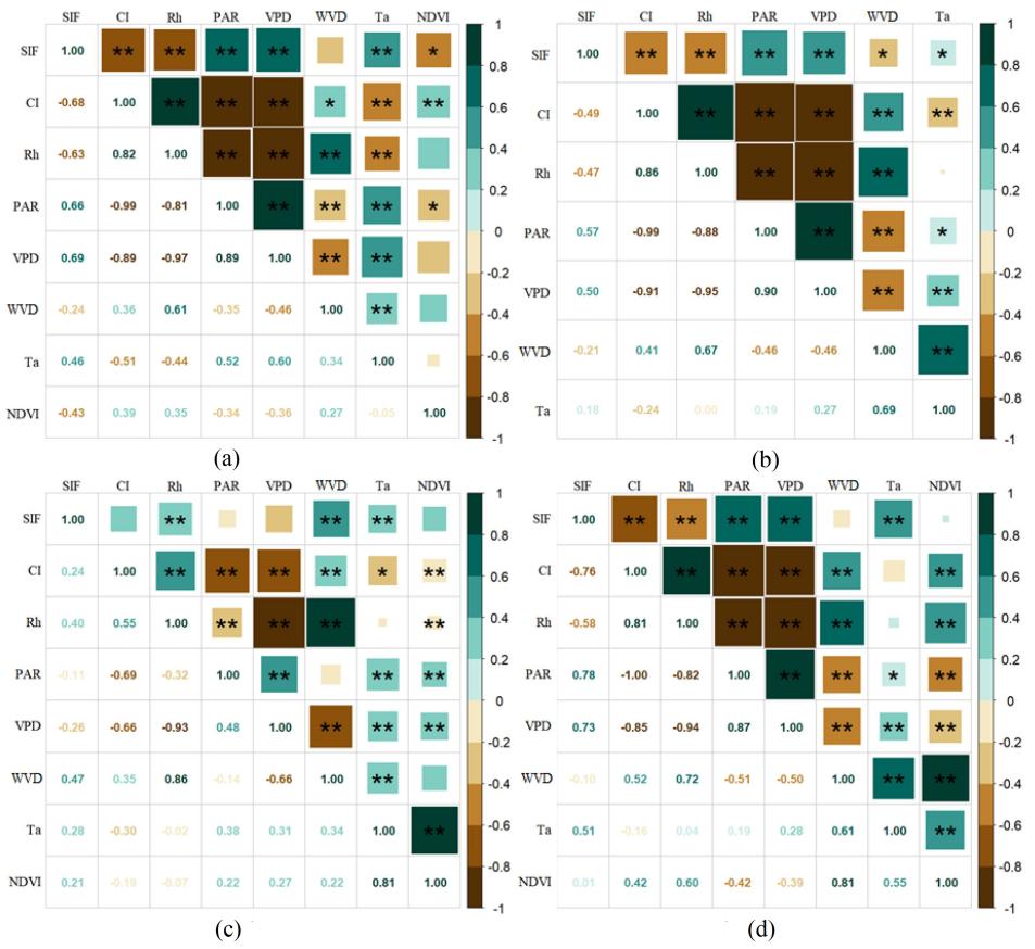 研究进一步揭示了环境因子对植被光合作用的季节差异调控机制:非生长季大气水分条件是影响针叶林SIF的主导因子,而生长季则转为光合有效辐射和饱和水汽压差主导。基于广义加性模型,团队重建了2019–2024年连续SIF动态数据,趋势分析显示灌丛植被光合能力呈显著增强趋势。该研究为理解亚高山植被对气候变化的适应策略提供了新的生理生态视角。