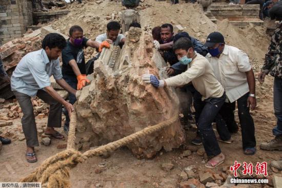 资料图:当地时间4月30日,尼泊尔巴德岗的广场上,人们用绳子拉走一块古庙墙壁的残骸。