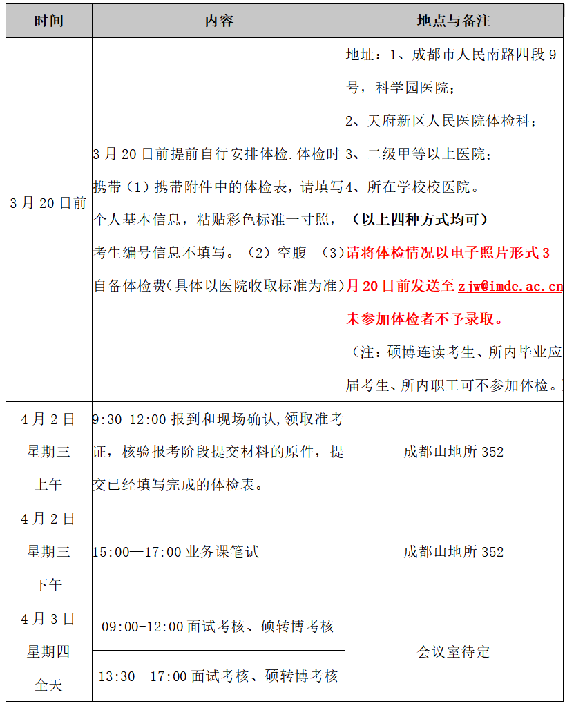 招生简章 首页>研究生教育>招生动态>招生简章 关于调整中国科学院成都山地所2025年博士研究生“申请-考核”制度综合考核时间安排的公告 发布时间:2025-02-21 字号:【 小中大 】 各位博士考生: 因招生考试工作安排调整,《中国科学院成都山地所2025年秋季入学博士研究生招生考试时间安排》中我所博士普通招考“申请-考核”制度综合考核时间由原定3月20-21日调整到4月2-3日进行,体检时间改为3月20日前自行安排完成即可,考试方式不变。