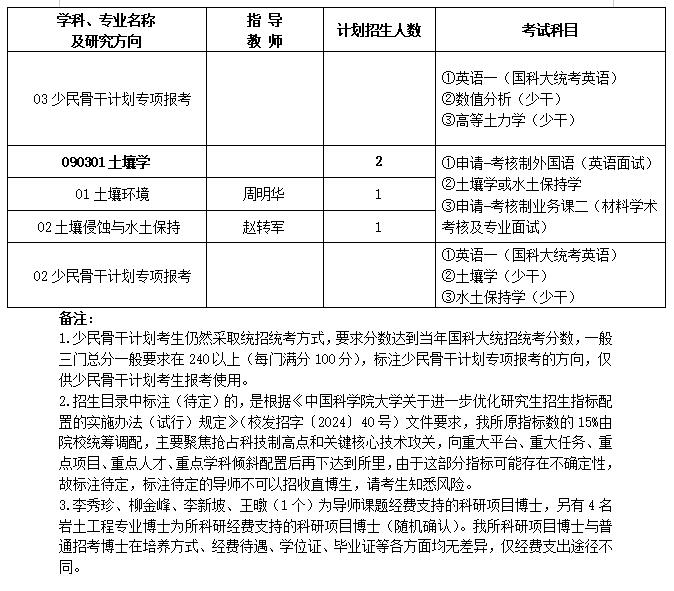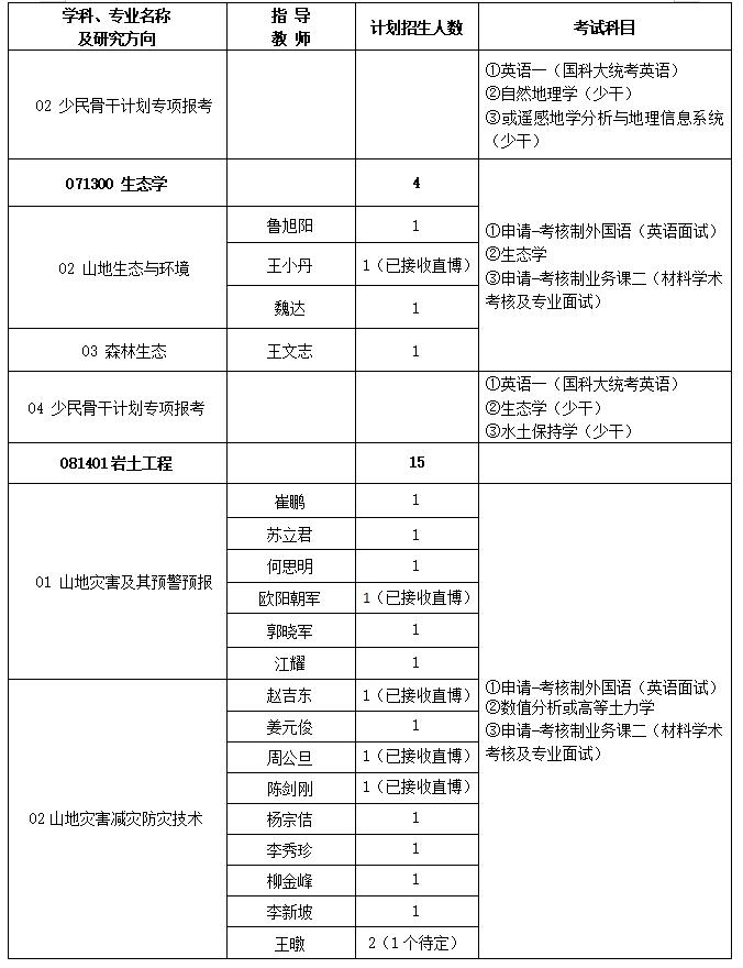 特别说明:我所招生简章招生人数目前是按照招生的总人数公布(国科大公布的招生目录信息是按照预计招收直博生和预计接收统招生分开公布),直博生占当年博士招生计划数,直博生接收实际情况以我所公示的《2026年度中国科学院、水利部成都山地灾害与环境研究所推荐免试硕士研究生(直博生)拟录取公示》为准,本简章也将明确标明指标情况,请考生关注。
