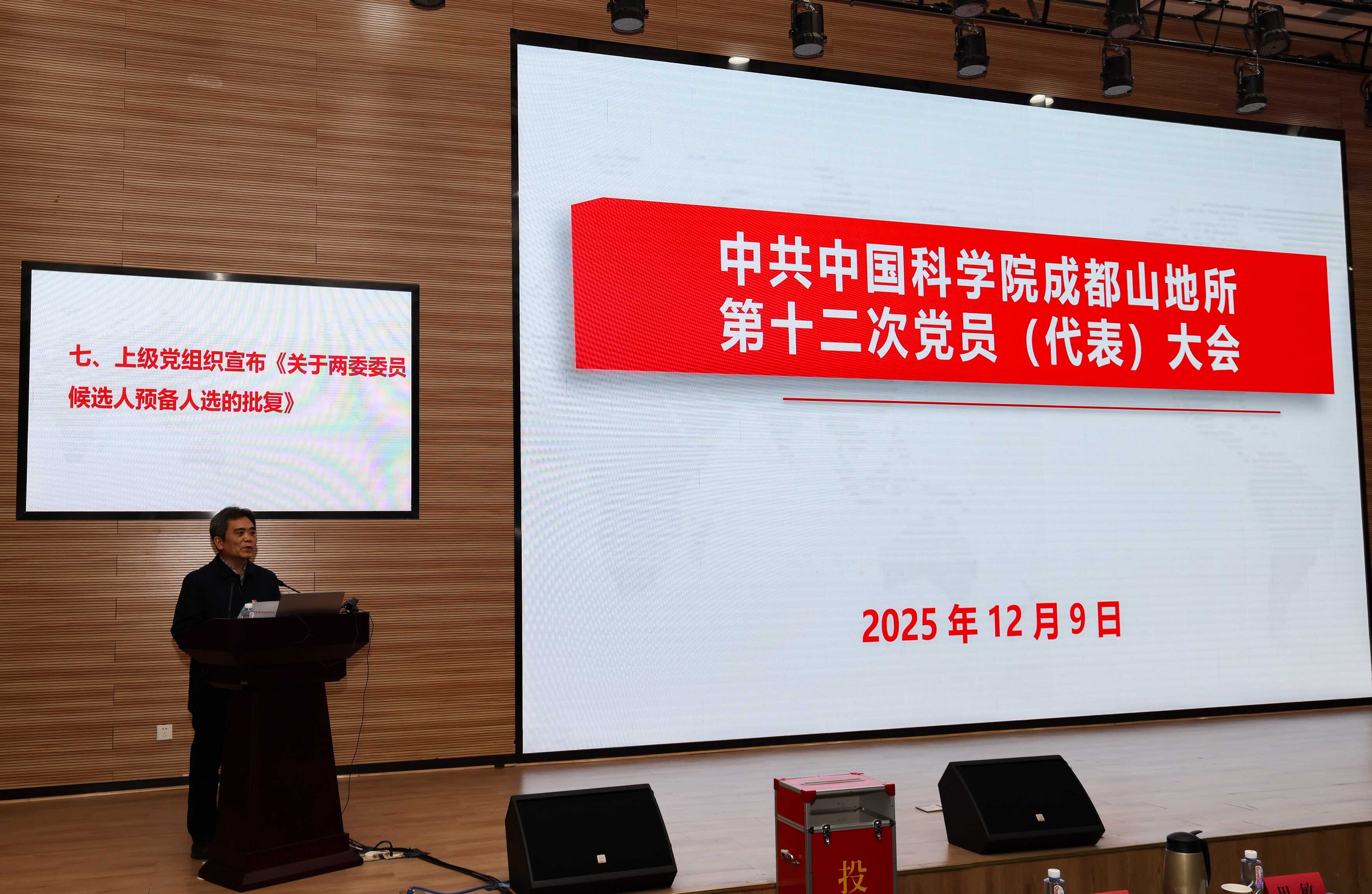 12月9日,成都山地所召开第十二次党员代表大会,总结所党委和所纪委五年来的工作,选举产生新一届党委委员和纪委委员。党员代表、特邀代表和列席代表等共180余人参加大会。成都分院院长、分党组书记、系统单位党委书记王嘉图,分院四级高管田敏和分院党建工作处处长胡鹏出席会议。大会主席团执行主席、成都山地所党委书记、副所长谭多财主持会议。