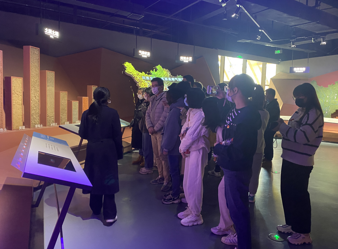 “载芟载柞,其耕泽泽。千耦其耘,徂隰徂畛”先秦《诗经》就有篇章描绘古代浩大的农事活动,《汉书·文帝纪》中就以“农,天下之大本,民所恃以生也”强调了农业的重要性,在中华农耕文明博物馆的整体建筑按照“天下粮仓”理念设计而成,呈现出“丰收满仓”的景象。馆内常设“天府农耕文明”“脱贫攻坚”“农民工”三大主题展览,青年学子们通过参观博物馆保存的农业文物、标本、古籍和传统农具等各类藏品,聆听讲解,以及观看多媒体投影互动,形成河流、水系、气候、植物资源等内容,享受了一场视听盛宴,于时间的洪流中窥见中华农业文明灿烂辉煌之一隅。全方位了解了四川天府农业文明,也了解了科技如何改变传统农业,实现对“靠天吃饭”农业的“逆天改命”,确保粮食安全,以及乡村振兴的重大意义。