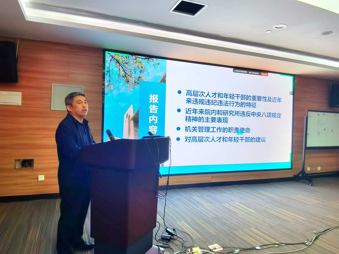 谭多财首先阐述了深入贯彻中央八项规定精神学习教育的重要意义,介绍了本次培训的背景和目的,重点从高层次人才和年轻干部的重要性及近年来违规违纪违法行为的特征、院内和研究所违反中央八项规定精神的主要表现、机关管理工作的职责使命、对高层次人才和年轻干部的建议等四个方面进行了专题授课,并利用近年来院里通报的大量违规违纪典型案例进行了剖析讲解。他指出,高层次人才是研究所科技创新的第一资源,年轻干部是研究所高质量发展的生力军,要牢记国家科研机构的使命担当,保持进取心,增强责任心,做到工作扎实、视野宽阔、心胸宽广;要在拼搏进取、奋战事业的同时,正确处理好公与私、权与钱、名与利、法与情的关系,避免“早节”失守、权力脱缰,由风及腐、由风变腐;要牢记“守纪法底线,保家庭幸福,促科技创新”核心理念,在各种利益诱惑面前保持强大定力,防止成长的“黄金期”变为贪腐的“危险期”; 要以忠诚、干净、担当作为事业有成和安身立命的根本,廉洁自律、恪尽职守,做到守底线、知敬畏、存戒惧。