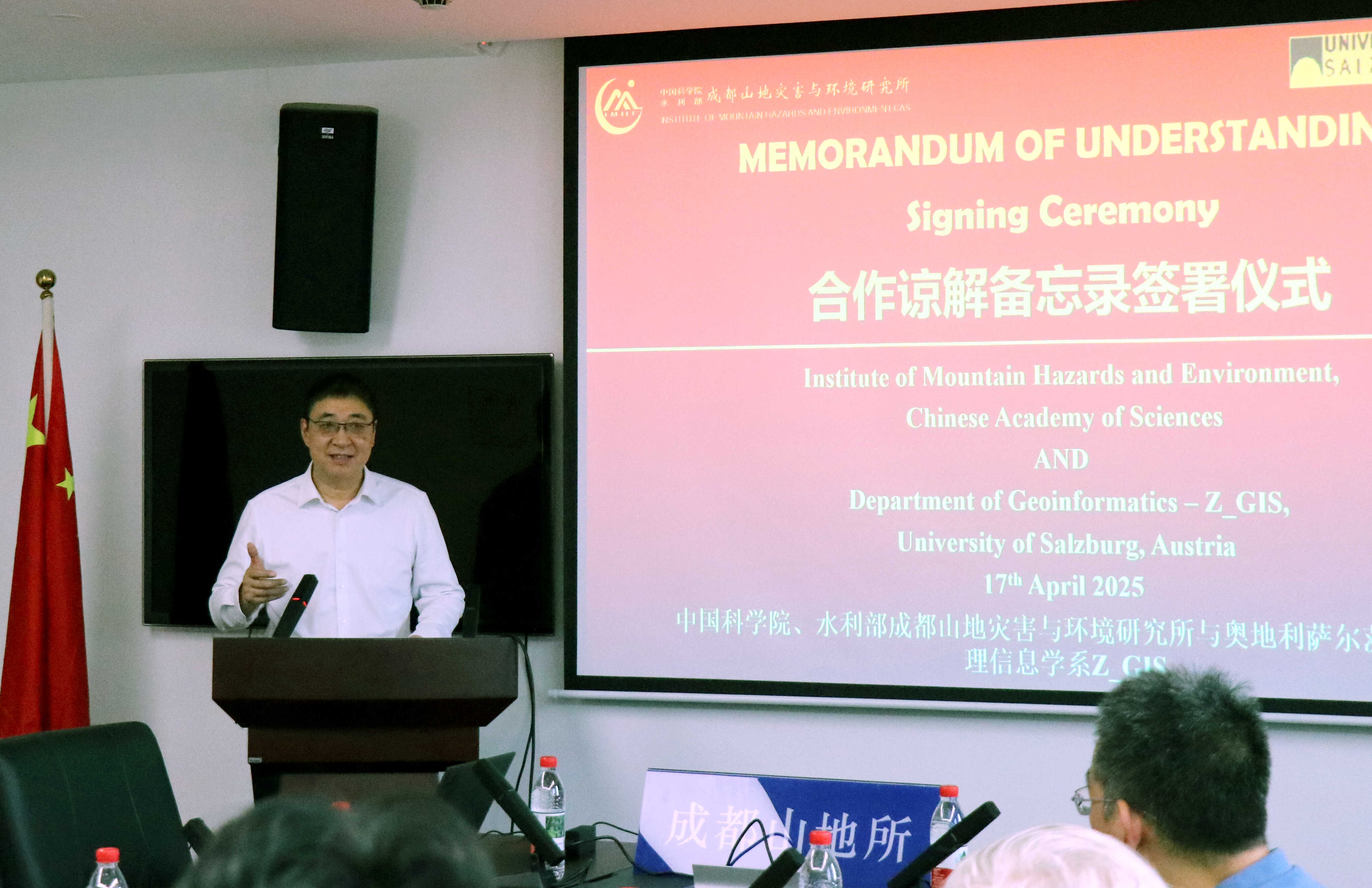 康世昌与Thomas Blaschke代表双方共同签署了合作谅解备忘录,明确了合作双方在科研人员/研究生互访交流、合作研究、联合讲座与研讨会举办、数据资源共享等合作内容。根据备忘录,双方将以山地灾害防治、山地生态保护、数字山地技术与山区可持续发展为核心,构建跨洲科研合作网络,通过阿尔卑斯-喜马拉雅山地合作研究,为全球山地可持续发展提供新思路。