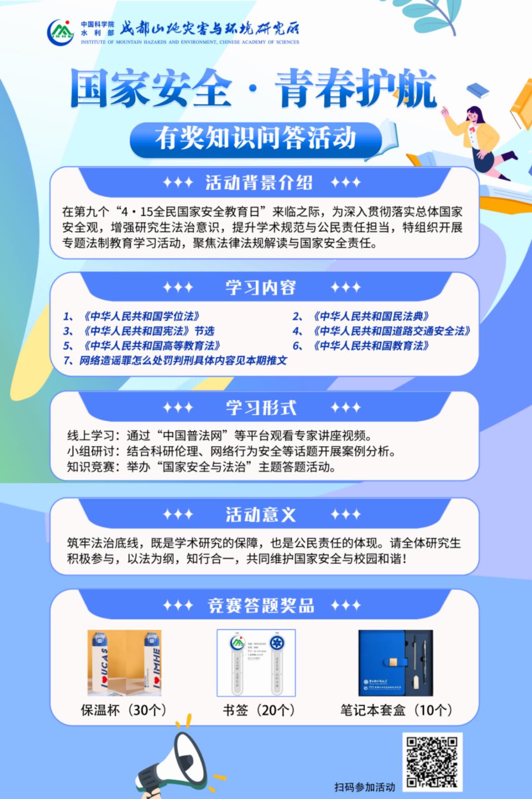 为推动学习成果转化,成都山地所开展国家安全与法治线上竞答活动,吸引全所研究生踊跃参与。竞答题目紧扣前期学习的法律法规知识,兼具专业性与趣味性。活动还设置抽奖环节,中奖同学可获赠印有专属 logo 的文创产品,以此激发学生学习热情,在全所范围内形成“比学赶超”的浓厚普法氛围,让国家安全与法治观念深入人心。