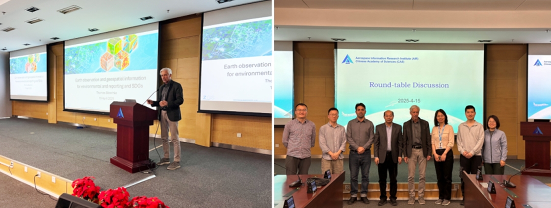 4月15日,与何国金研究员团队开展圆桌讨论,双方就遥感与环境监测领域的未来发展方向进行了深入探讨。Thomas教授作了题为“Earth observation and geospatial information for environmental and reporting and SDGs”的报告,分享了他在环境监测和SDGs报告策略方面的专业知识。