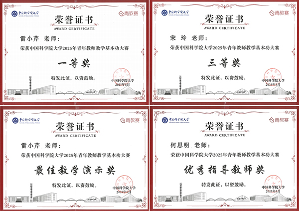 在青年教师教学能力竞赛领域,青年教师们依托成都学院开设的山地科学相关专业课程,凭借教学方案、备课功底与教学风格,在国科大青年教师教学竞赛中获奖。其中,雷小芹副研究员获一等奖和“最佳教学演示奖”,宋玲副研究员获三等奖,何思明研究员获优秀指导教师奖。这些奖项是对青年教师教学能力的认可,也体现了成都山地所“以赛促教、以老带新”教学传承机制的成效。