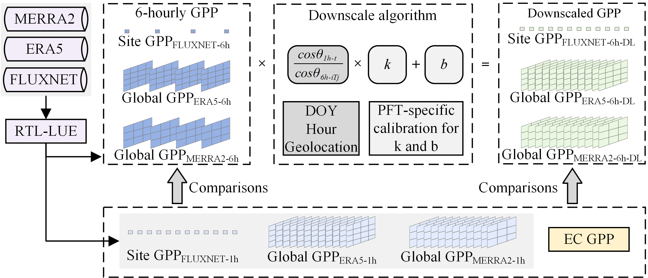 针对现有GPP数据时间分辨率不足的问题,团队还创新开发了一种高效的时序降尺度算法。该算法以6小时分辨率的全球GPP数据为基础,通过引入每小时太阳天顶角作为权重进行分配,最终可获取1小时分辨率的GPP数据集。全球尺度验证结果表明,降尺度处理使得GPP的年总值偏差从4.14 gC/yr显著降低至0.53 gC/yr,小时尺度的平均相对误差从32.40%下降至18.49%。